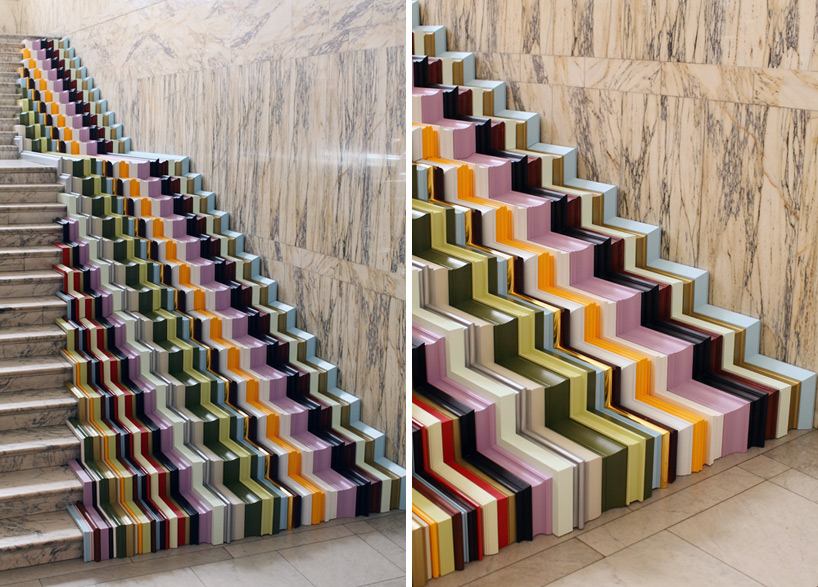 UK designer Stuart Haygarth created a manicured pathway along marble steps of the entrance inside the Victoria & Albert Museum for the London Design Week. Collaborating with custom framers John Jones, he uses over 600 meters / 1968.5 feet of custom painted frames, hence the artwork titled "Framed." The frames are of different profiles and sizes, which add to the three-dimensional quality.